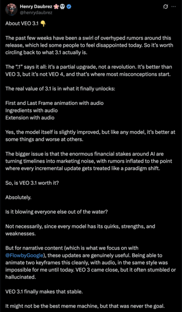 In einem kürzlich erschienenen X-Beitrag bezeichnete Daubrez die Veröffentlichung von Veo 3.1 als grundsätzlich inkrementell, obwohl das Update in der breiten Berichterstattung als Paradigmenwechsel dargestellt wurde. „Die enormen finanziellen Risiken rund um KI“ erzeugen Druck, der bescheidene Funktionserweiterungen in als revolutionär vermarktete Ereignisse verwandelt, sagte er und räumte ein, dass Veo 3.1 fügt nützliche Funktionen hinzu wie etwa Bild-zu-Bild-Animation, stellen diese eher geringfügige Verbesserungen als Durchbrüche dar.
