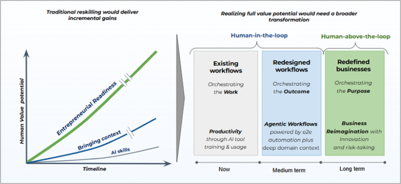 Le troisième impératif, et le plus transformateur, consiste à développer l'esprit d'entreprise, permettant ainsi une véritable transition vers une prise en main humaine. À mesure que l'IA prend en charge les tâches d'exécution complexes, les humains se recentrent sur la création : nouveaux produits, entreprises, modèles d'engagement client et sources de revenus entièrement nouvelles. Pour les banques et les gestionnaires de patrimoine, la véritable opportunité ne réside pas seulement dans l'automatisation des processus existants, mais dans la réinvention des modèles économiques : services de conseil basés sur l'IA, produits patrimoniaux personnalisés et modèles de risque opérationnels en temps réel. L'humain, en position de leader, définit le sens, oriente l'innovation et crée une valeur transformatrice.