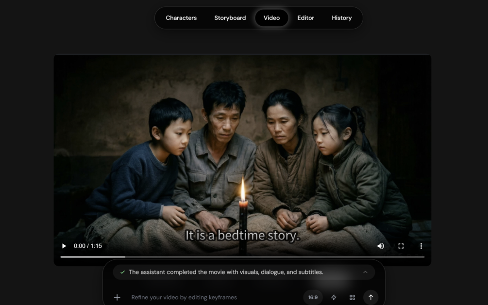 D'une simple commande, le storyboard a été transformé en une vidéo cinématographique composée de plusieurs scènes. Le système prend actuellement en charge des séquences multi-scènes comportant jusqu'à seize plans et des vidéos d'une durée proche d'une minute—nettement plus long que de nombreux outils vidéo IA existants.