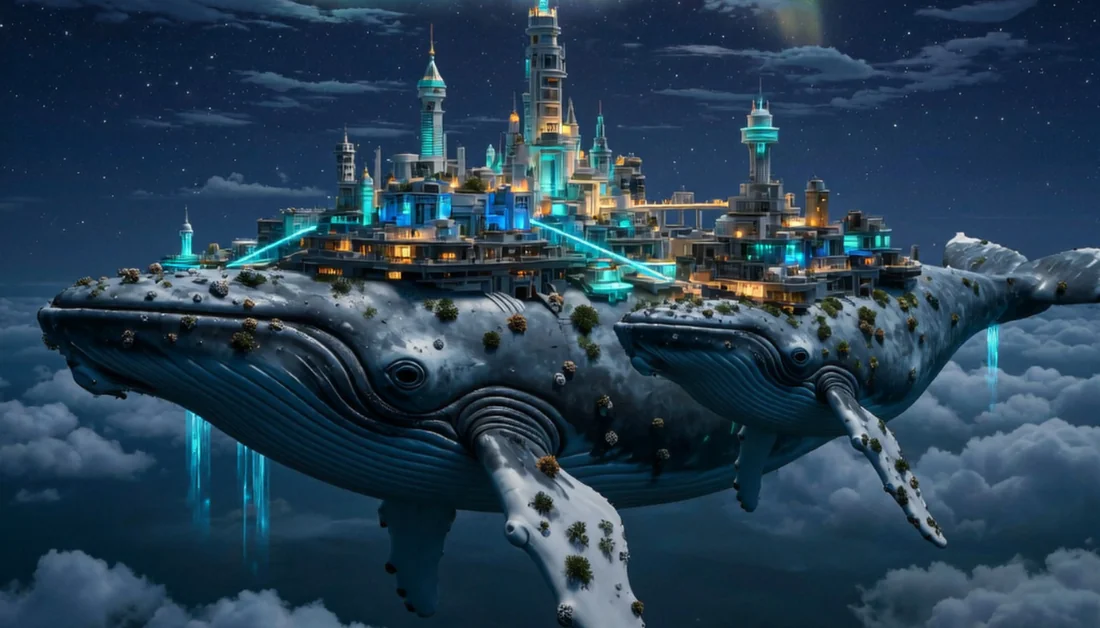 “A floating city built on the backs of giant whales, glowing softly under an aurora sky.”