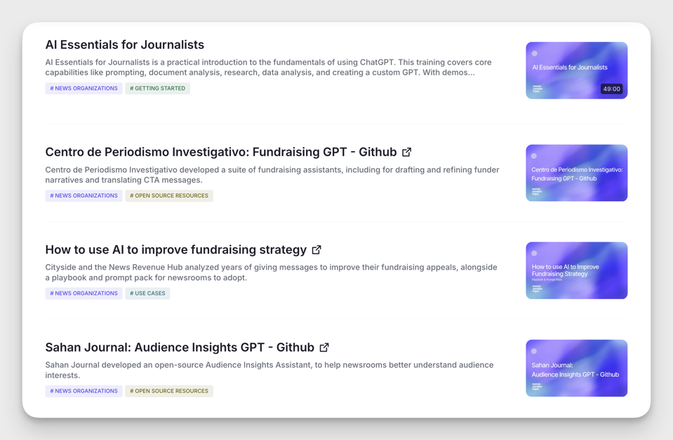 הפלטפורמה מציעה הדרכה לפי דרישה, ספרי הדרכה ומחקרי מקרה המכסים מחקר חוקר, תרגום, ניתוח נתונים ויעילות הפקה. זהו הניסיון הישיר ביותר של החברה למצב את עצמה כשותפה ולא כאיום על תעשיית החדשות.