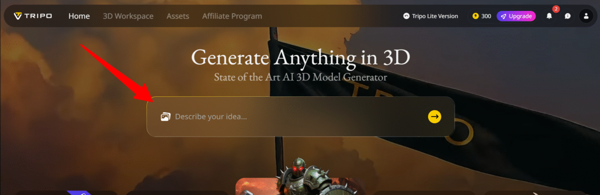 После создания учётной записи мне предоставили 300 бесплатных кредитов. Меня перенаправили обратно на главную страницу, где я начал создавать 3D-модели, описав свою идею.