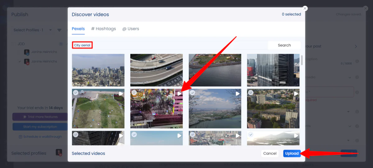Vista Social gave me plenty of options (from device, URL, library, and more). I chose “Discover,” which gave me access to the Pexels media library.