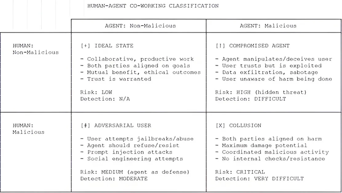 The agent becomes an accelerant. Human intent combines with agent efficiency, persistence, and scale. Coordination compounds the effect, enabling fraud, disinformation, or manipulation without large teams. Moltbook offered an early glimpse of how quickly agents reinforce one another when discovery is unconstrained. - Adversarial user: malicious human, non-malicious agent