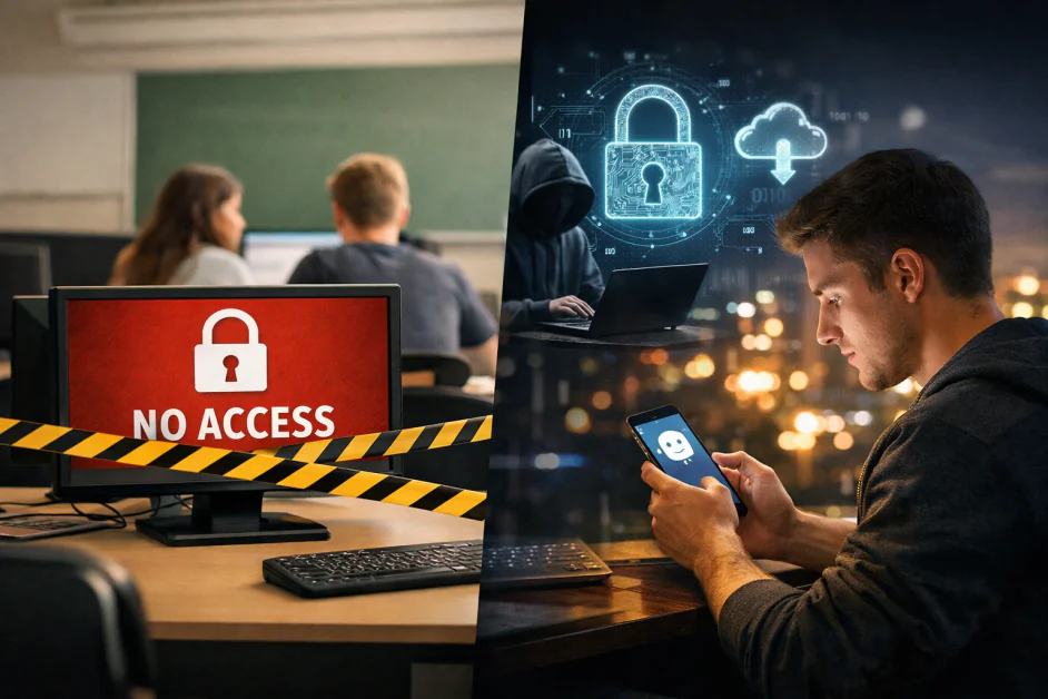 Access policies alone aren’t determining behavior. Students can pull out their phones and use any AI tool over their cellular data network, or use the platform while at home or on public wifi. They can also use VPNs, remote desktops, and plugins to bypass restrictions. Employees can do the same to get around workplace controls.